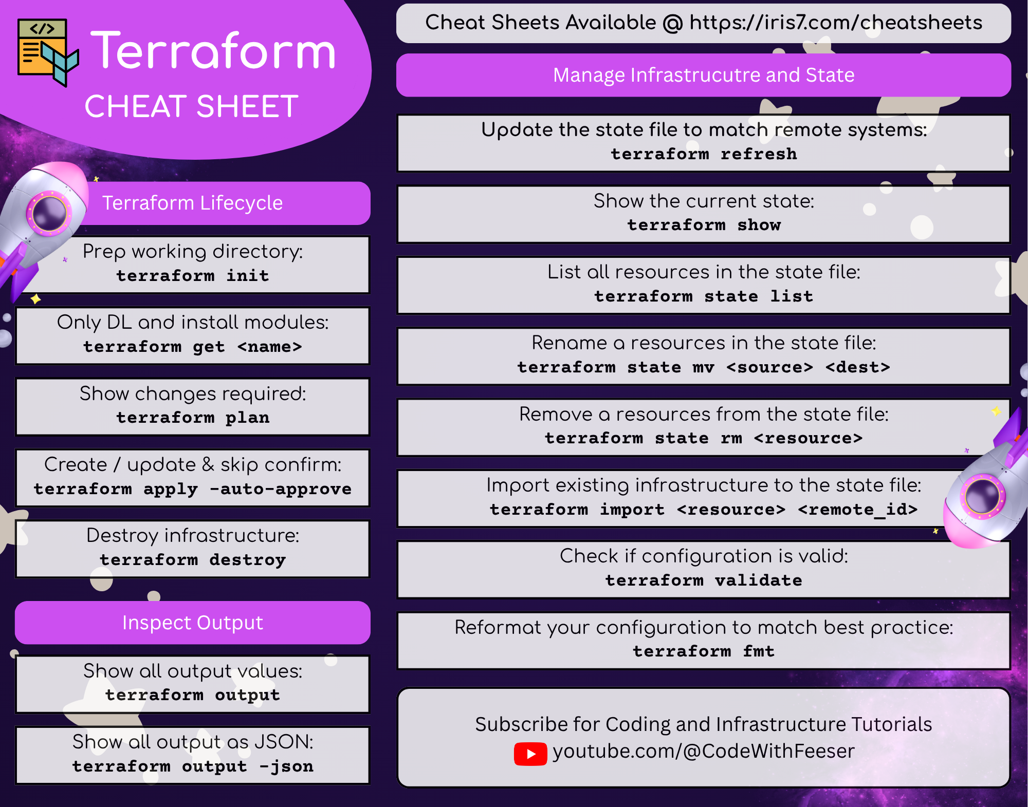 Cheat SheetsNot finding the cheat sheet you’re looking for? Send me a message and I’ll post it! Download Docker Cheat Sheet Download Terraform Cheat Sheet